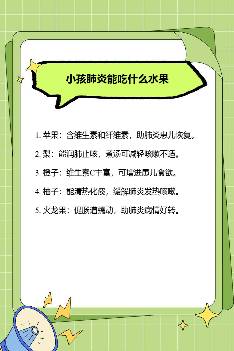 小孩肺炎可吃苹果、梨、橙子、柚子、火龙果等。