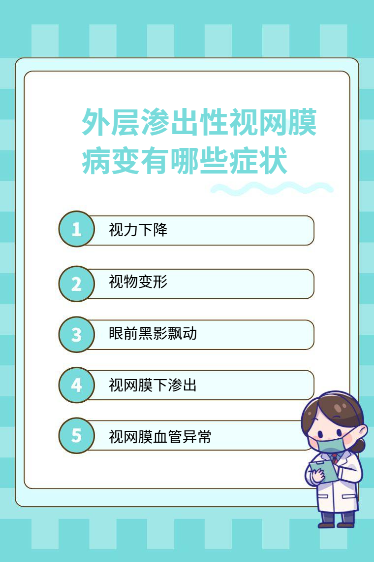 外层渗出性视网膜病变的症状有视力下降、视物变形、眼前黑影飘动、视网膜下渗出、视网膜血管异常等。