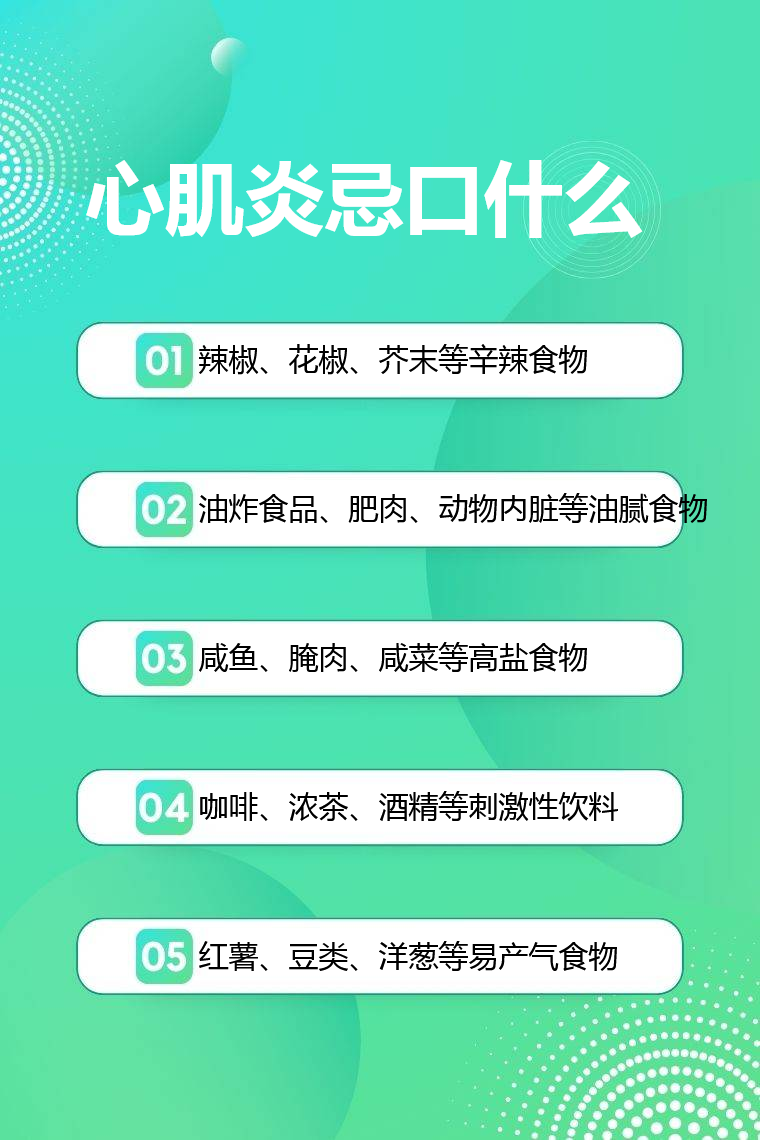 心肌炎患者需忌口辛辣食物、油腻食物、高盐食物、刺激性饮料、易产气食物等。