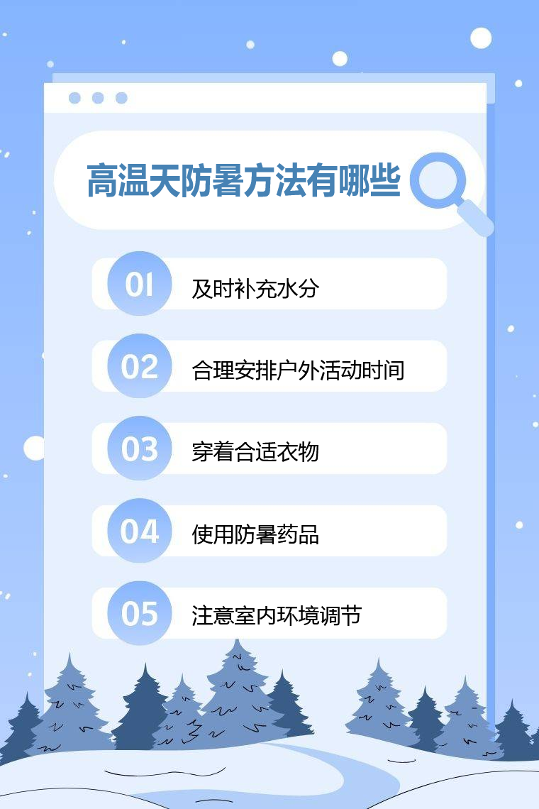 高温天防暑方法有及时补充水分、合理安排户外活动时间、穿着合适衣物、使用防暑药品、注意室内环境调节等。