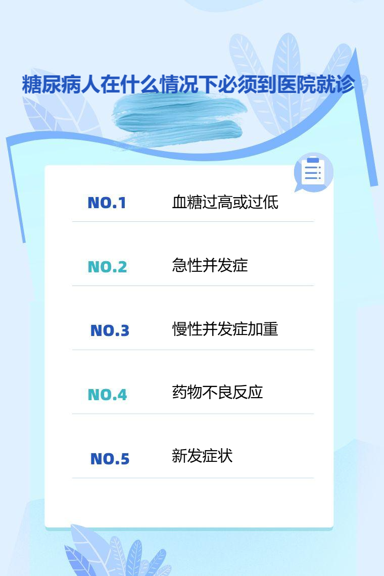出现血糖过高或过低、急性并发症、慢性并发症加重、药物不良反应、新发症状等情况时糖尿病人必须到医院就诊。