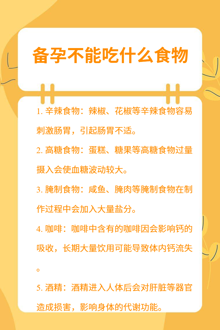 备孕不能吃辛辣食物、高糖食物、腌制食物、咖啡、酒精等。