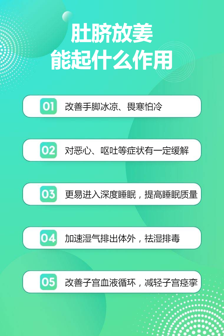 4. 祛湿排毒:湿气重会影响身体健康,导致身体沉重、疲劳等。姜有一定祛湿功效,肚脐放姜可通过穴位作用,促进身体新陈代谢,加速湿气排出体外,达到祛湿排毒效果,让身体更轻松。