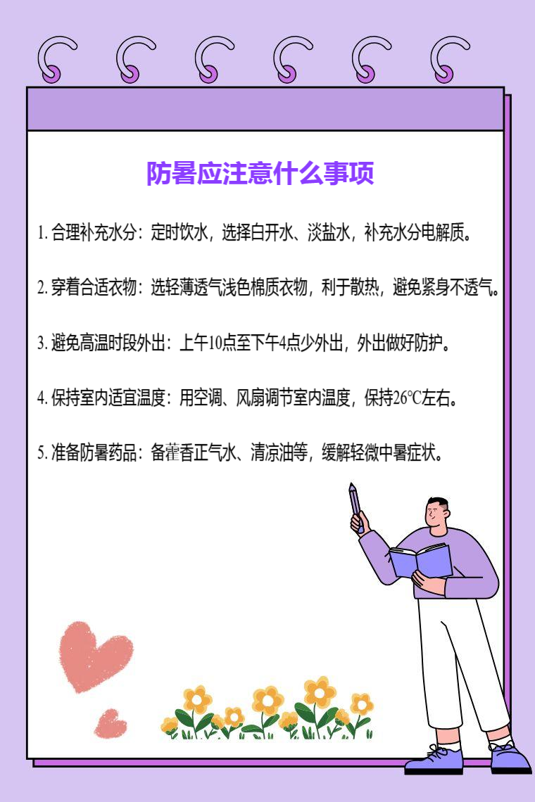 防暑应注意合理补充水分、穿着合适衣物、避免高温时段外出、保持室内适宜温度、准备防暑药品等。