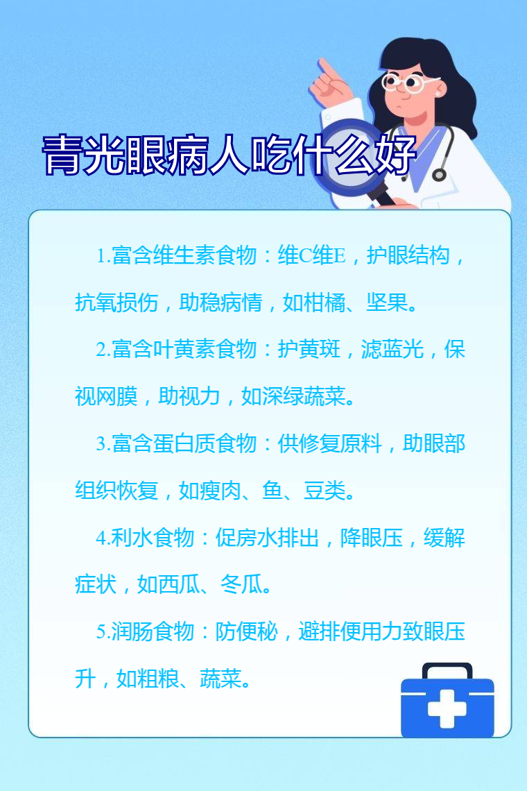 青光眼病人适宜食用富含维生素的食物、富含叶黄素的食物、富含蛋白质的食物、利水食物、润肠食物等。