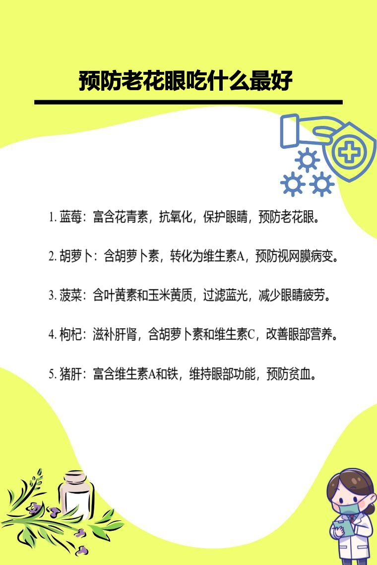 蓝莓、胡萝卜、菠菜、枸杞、猪肝等对预防老花眼有益。