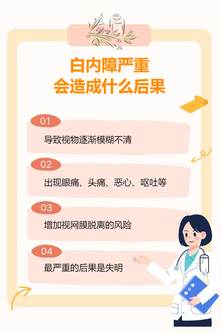 白内障严重会造成视力下降、青光眼、视网膜脱离、失明等后果。