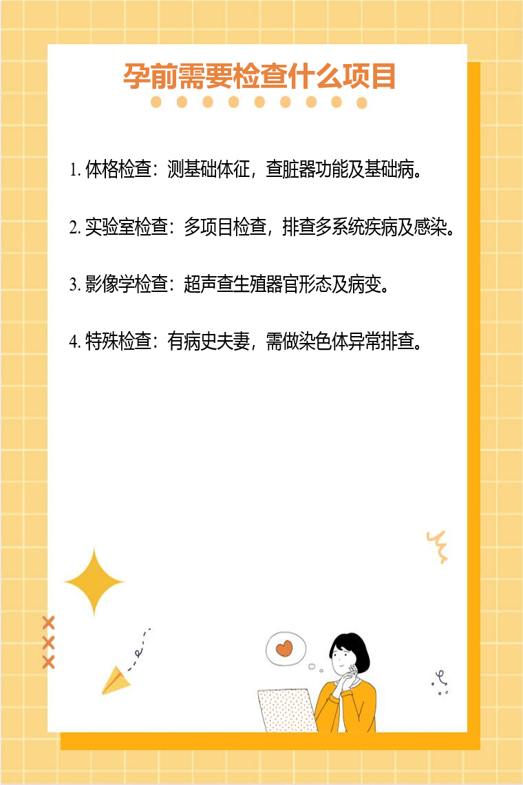 孕前检查项目包括体格检查、实验室检查、影像学检查、特殊检查等。