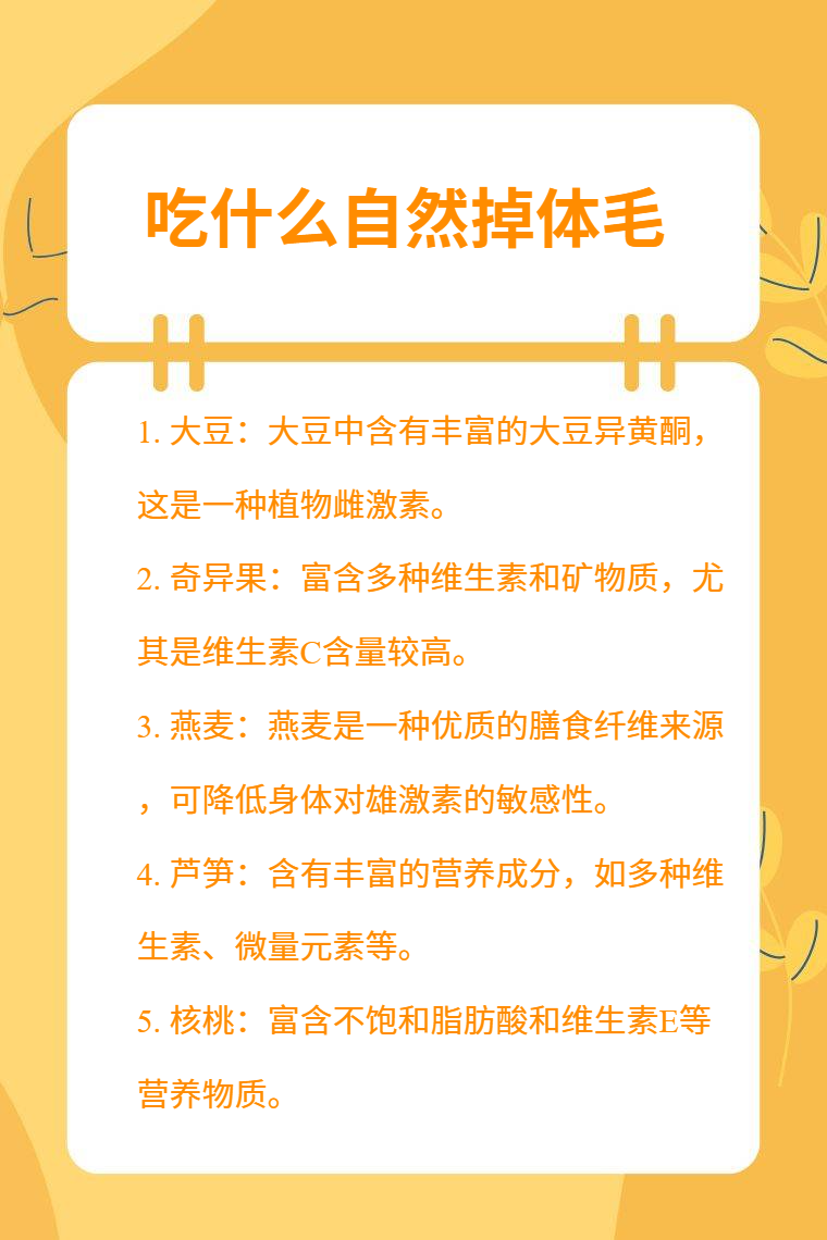 1. 大豆:大豆中含有丰富的大豆异黄酮,这是一种植物雌激素。其结构与人体雌激素相似,进入人体后可调节体内激素水平,一定程度上抑制雄激素分泌,而雄激素是导致体毛生长旺盛的重要因素,从而对减少体毛有一定帮助。
