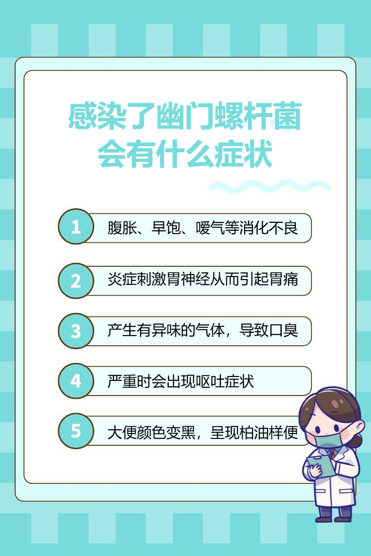 感染幽门螺杆菌可能出现消化不良、胃痛、口臭、恶心呕吐、黑便等症状。