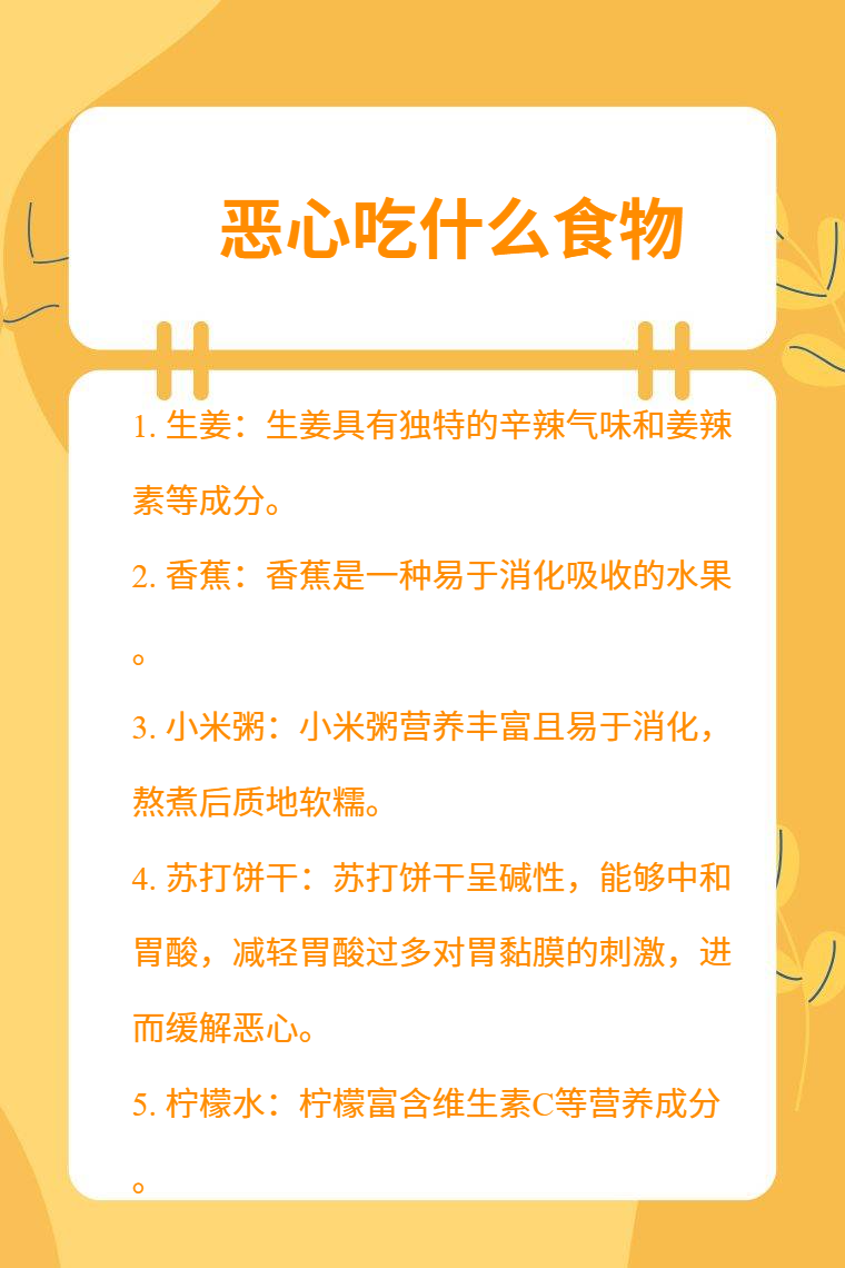 恶心时可选择吃生姜、香蕉、小米粥、苏打饼干、柠檬水等。