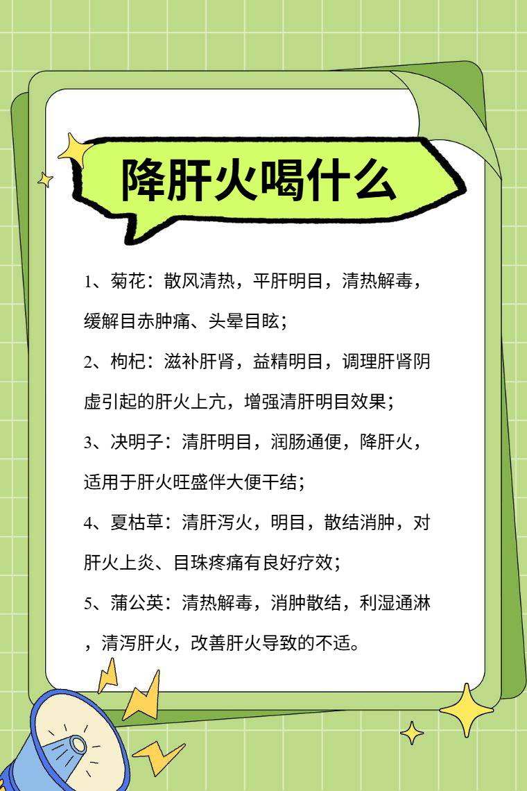 降肝火可饮用菊花、枸杞、决明子、夏枯草、蒲公英等泡的水。