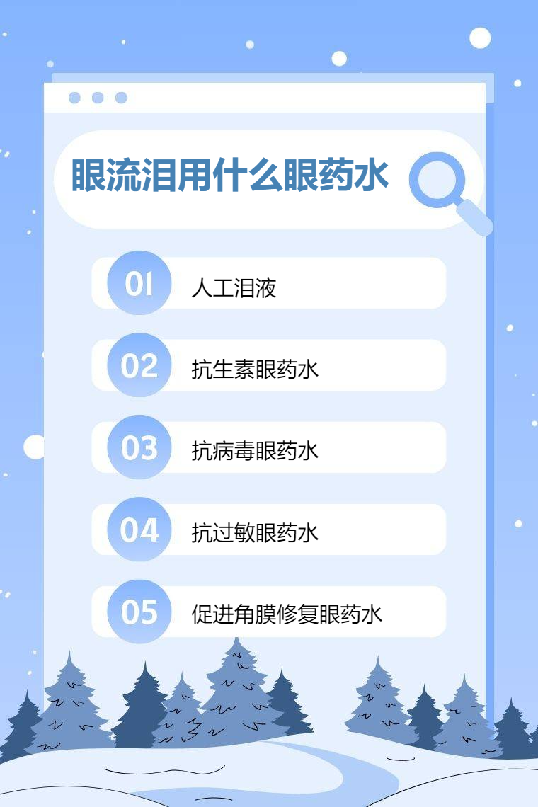 人工泪液、抗生素眼药水、抗病毒眼药水、抗过敏眼药水、促进角膜修复眼药水等可用于缓解眼流泪症状。