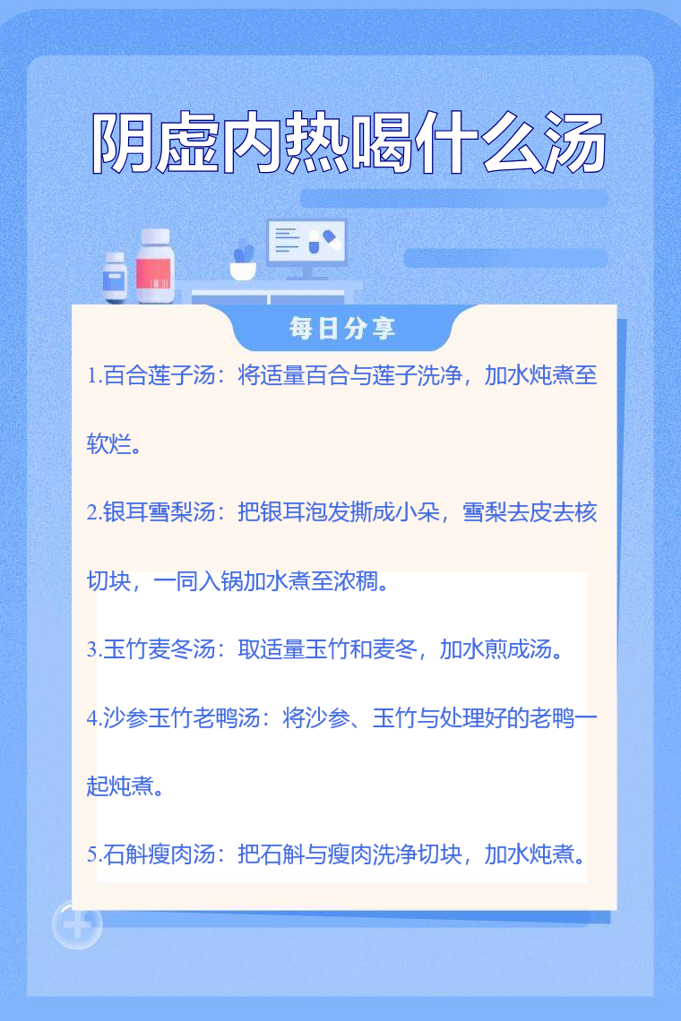 阴虚内热可喝的汤有百合莲子汤、银耳雪梨汤、玉竹麦冬汤、沙参玉竹老鸭汤、石斛瘦肉汤等。