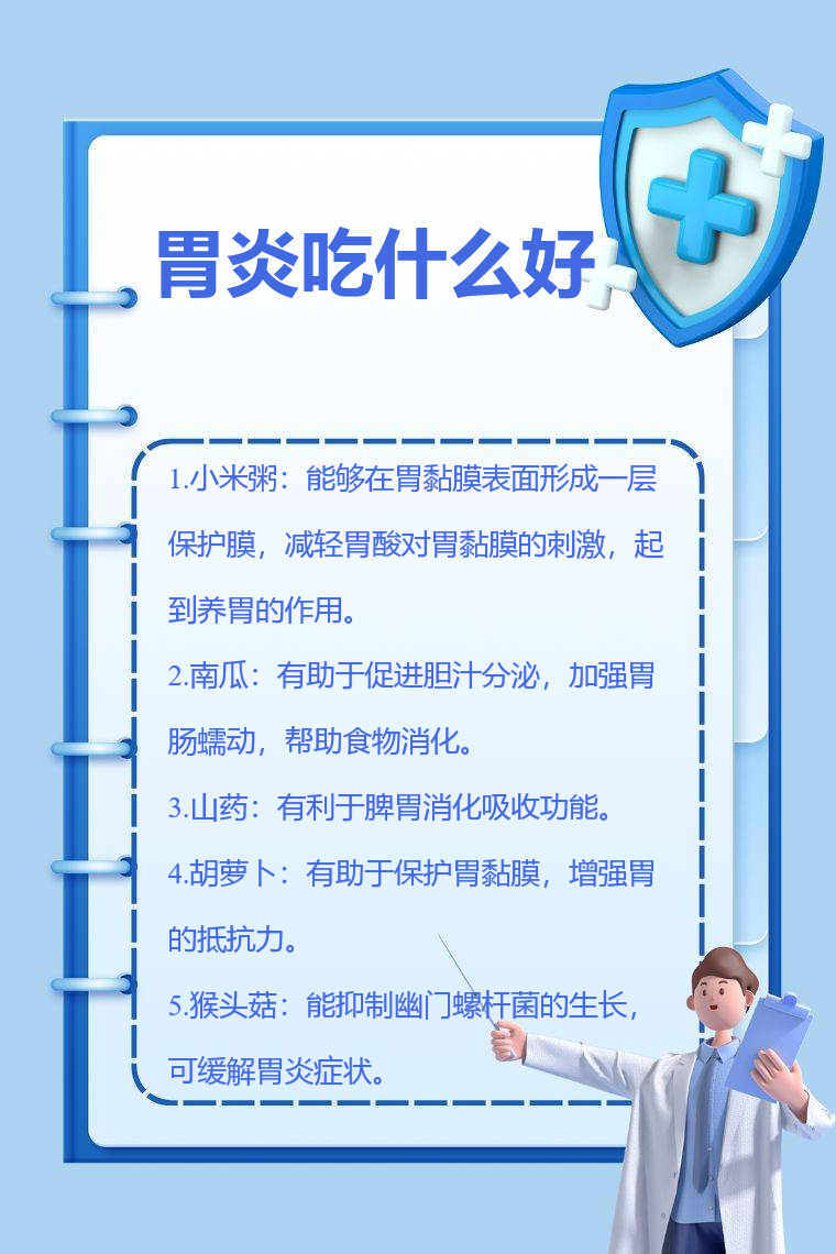 胃炎患者吃小米粥、南瓜、山药、胡萝卜、猴头菇等食物较好。