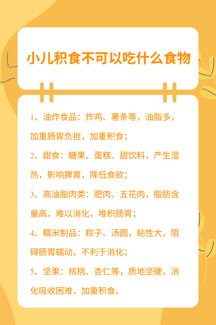小儿积食不可以吃油炸食品、甜食、高油脂肉类、糯米制品、坚果等。