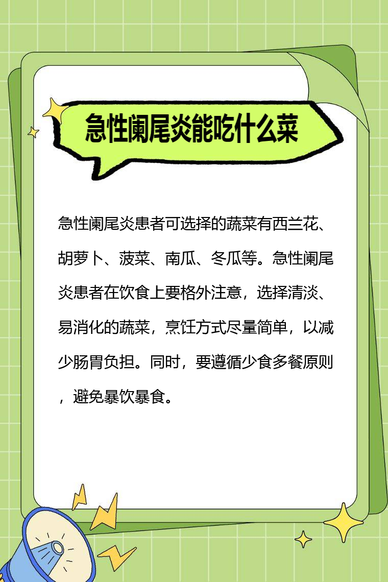 急性阑尾炎患者可选择的蔬菜有西兰花、胡萝卜、菠菜、南瓜、冬瓜等。