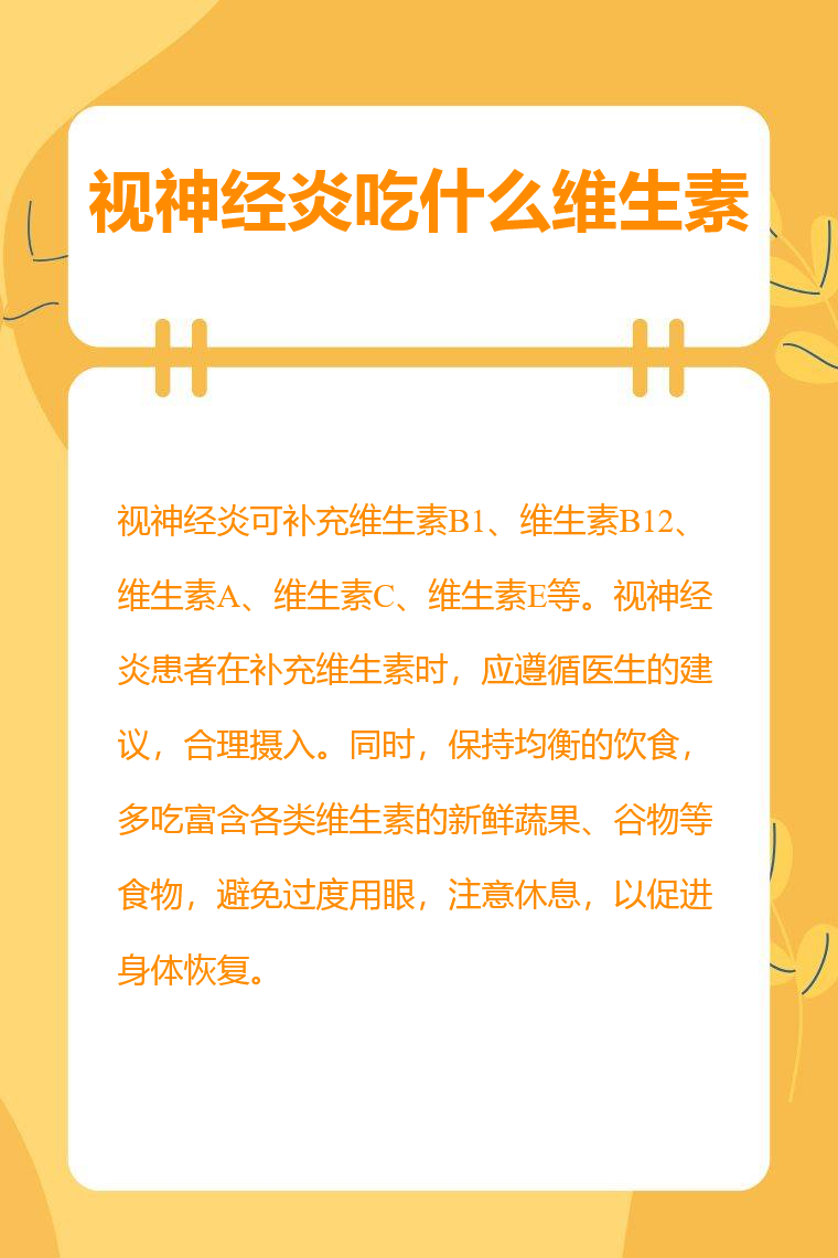 视神经炎可补充维生素B1、维生素B12、维生素A、维生素C、维生素E等。