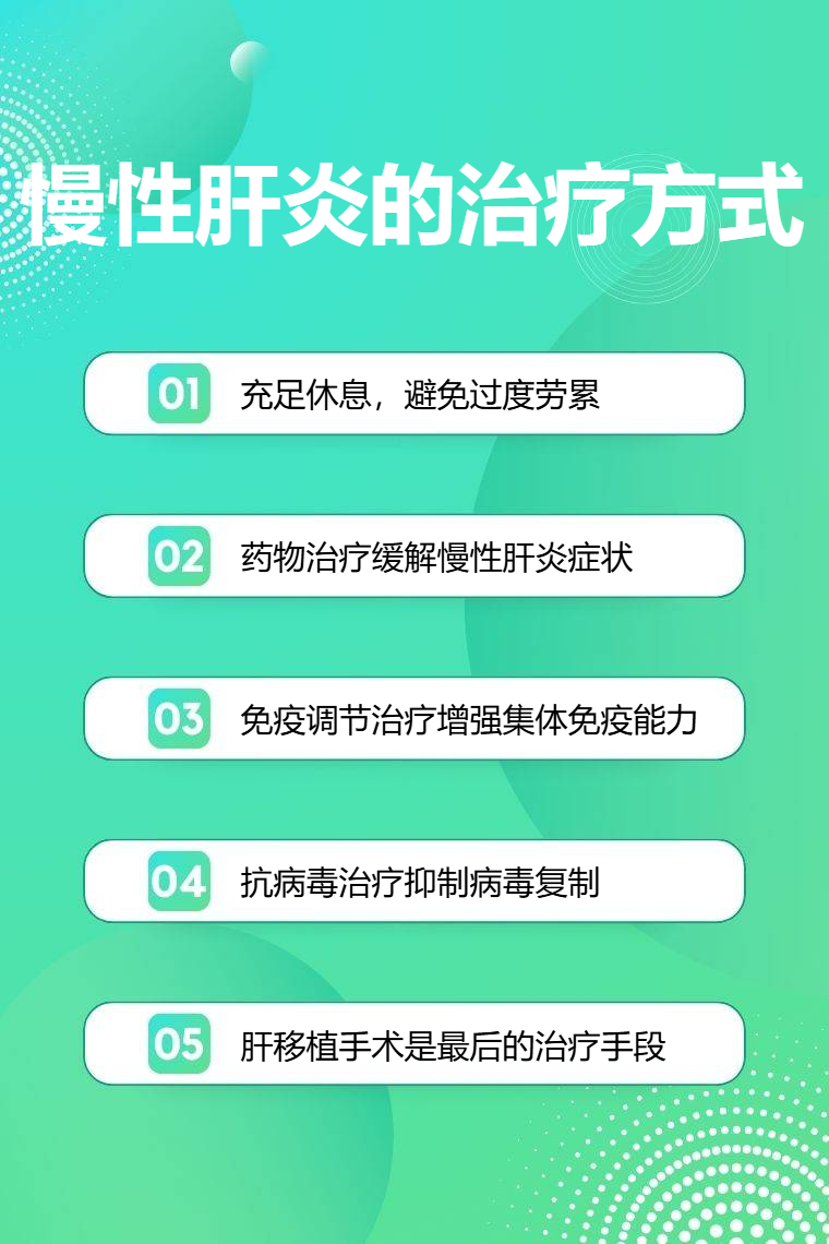 慢性肝炎的治疗方式主要有一般治疗、药物治疗、免疫调节治疗、抗病毒治疗、肝移植手术等。