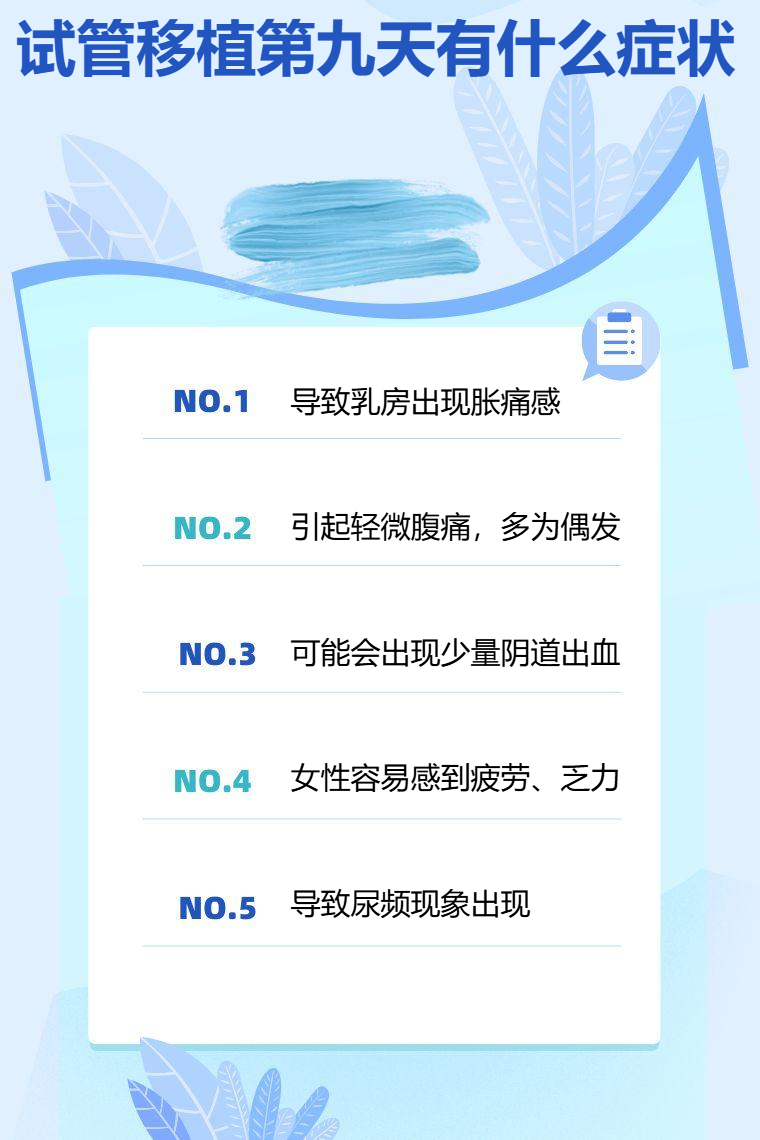 试管移植第九天可能出现的症状有乳房胀痛、轻微腹痛、少量阴道出血、疲劳乏力、尿频等。
