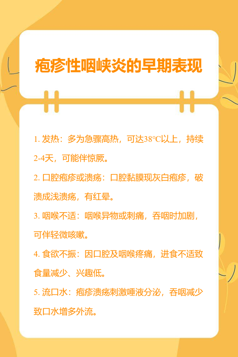 疱疹性咽峡炎的早期表现有发热、口腔疱疹或溃疡、咽喉不适、食欲不振、流口水等。