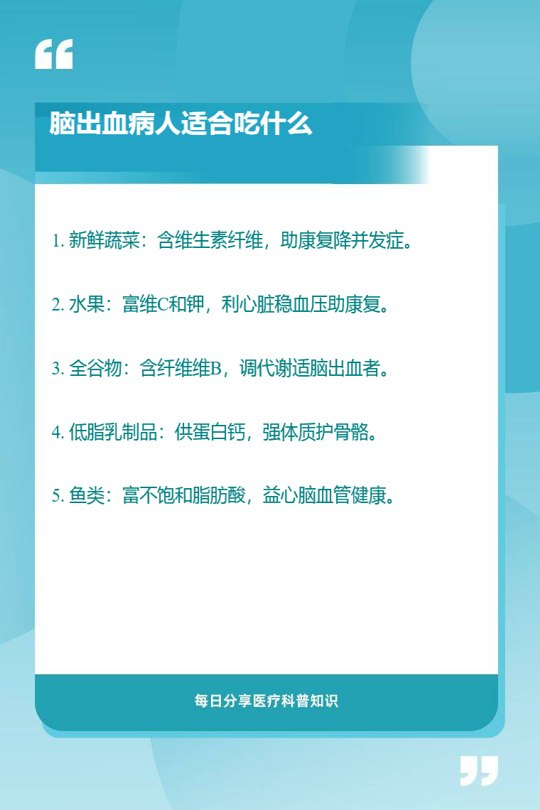 脑出血病人适合吃新鲜蔬菜、水果、全谷物、低脂乳制品、鱼类等。