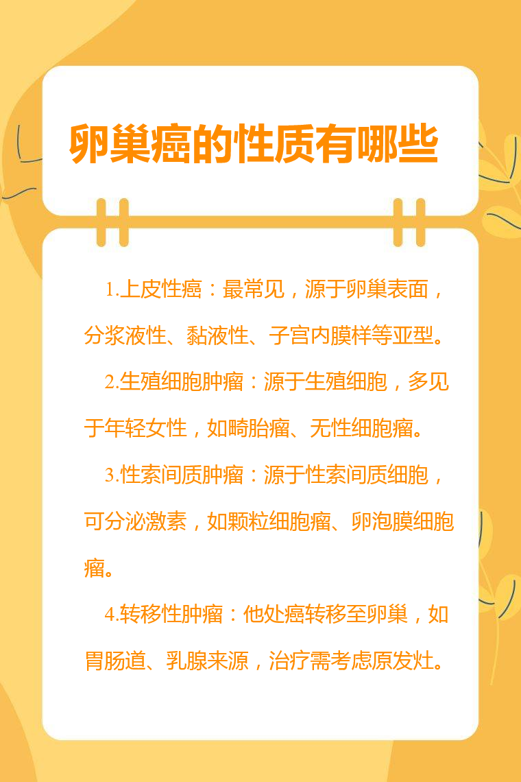 卵巢癌的性质有上皮性癌、生殖细胞肿瘤、性索间质肿瘤、转移性肿瘤等。