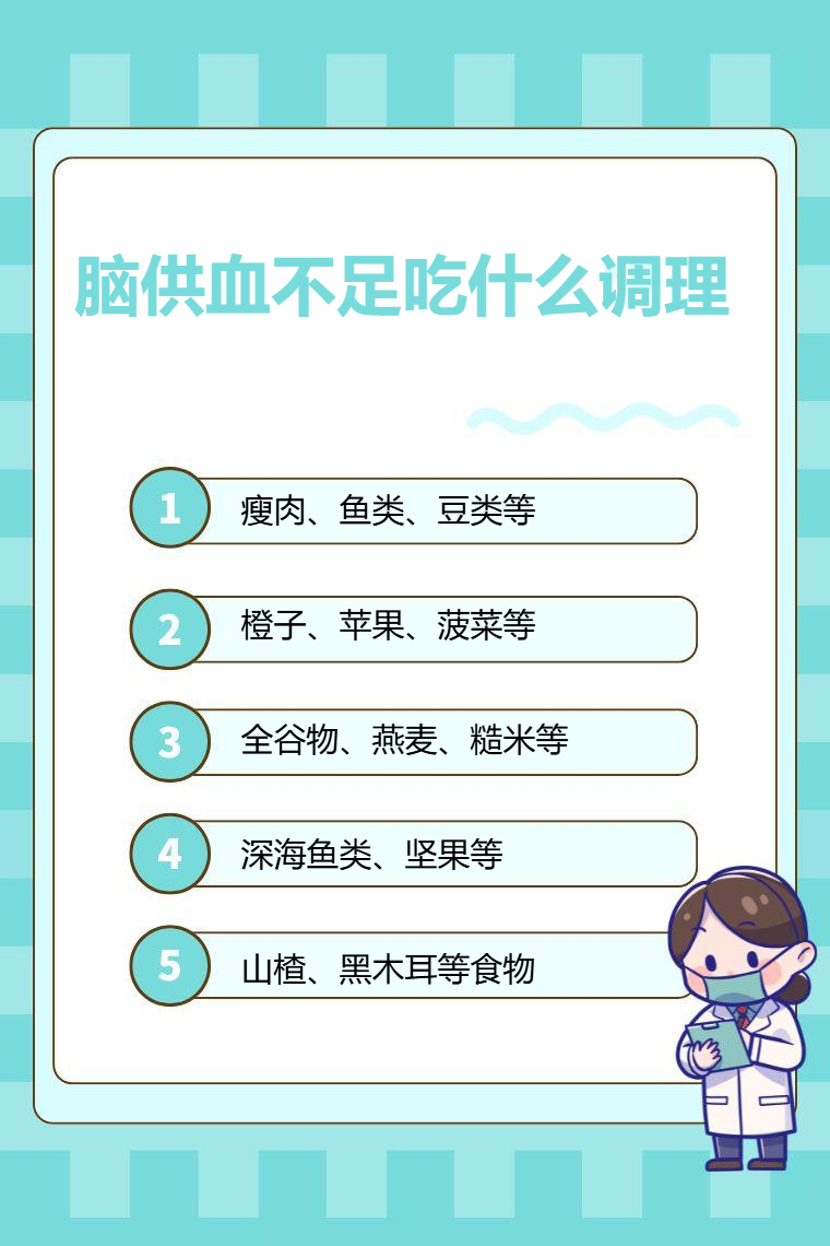 脑供血不足可通过食用富含蛋白质的食物、富含维生素的食物、富含膳食纤维的食物、富含不饱和脂肪酸的食物、具有活血化瘀功效的食物等进行调理。
