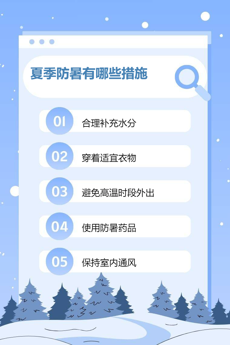 夏季防暑措施包括合理补充水分、穿着适宜衣物、避免高温时段外出、使用防暑药品、保持室内通风等。