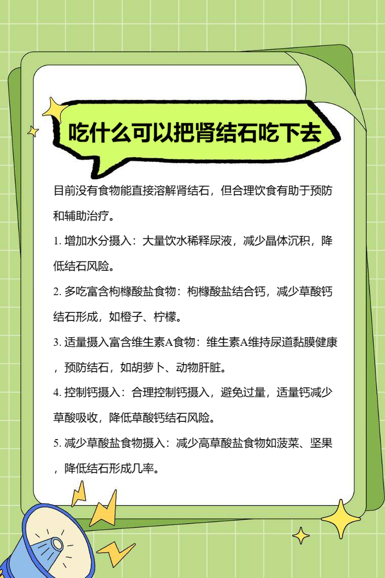 目前并没有食物可以把肾结石吃下去,但通过合理饮食有助于预防和辅助治疗肾结石,常见的有增加水分摄入、多吃富含枸橼酸盐食物、适量摄入富含维生素A食物、控制钙摄入、减少草酸盐食物摄入等。