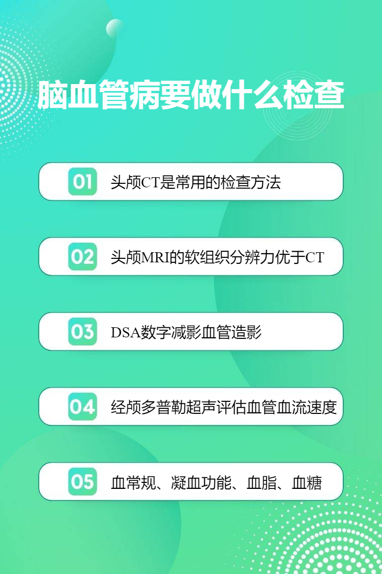 脑血管病要做的检查有头颅CT、头颅MRI、脑血管造影、经颅多普勒超声、血液检查等。