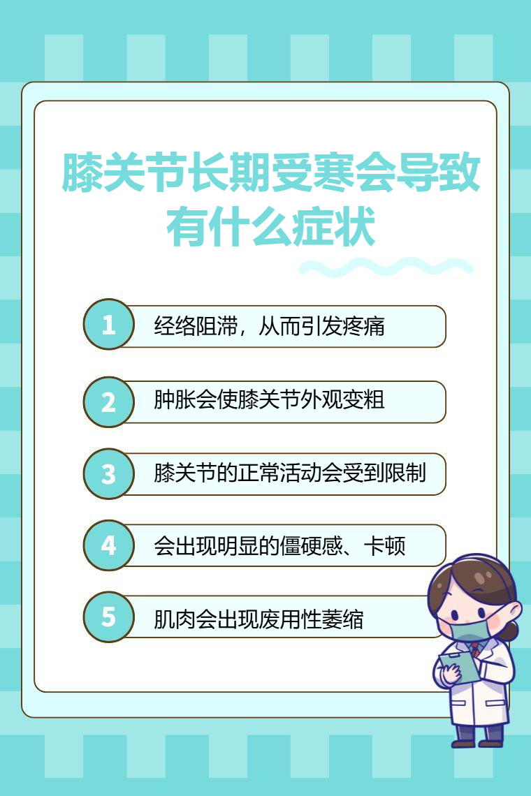 膝关节长期受寒会导致疼痛、肿胀、活动受限、僵硬、肌肉萎缩等。