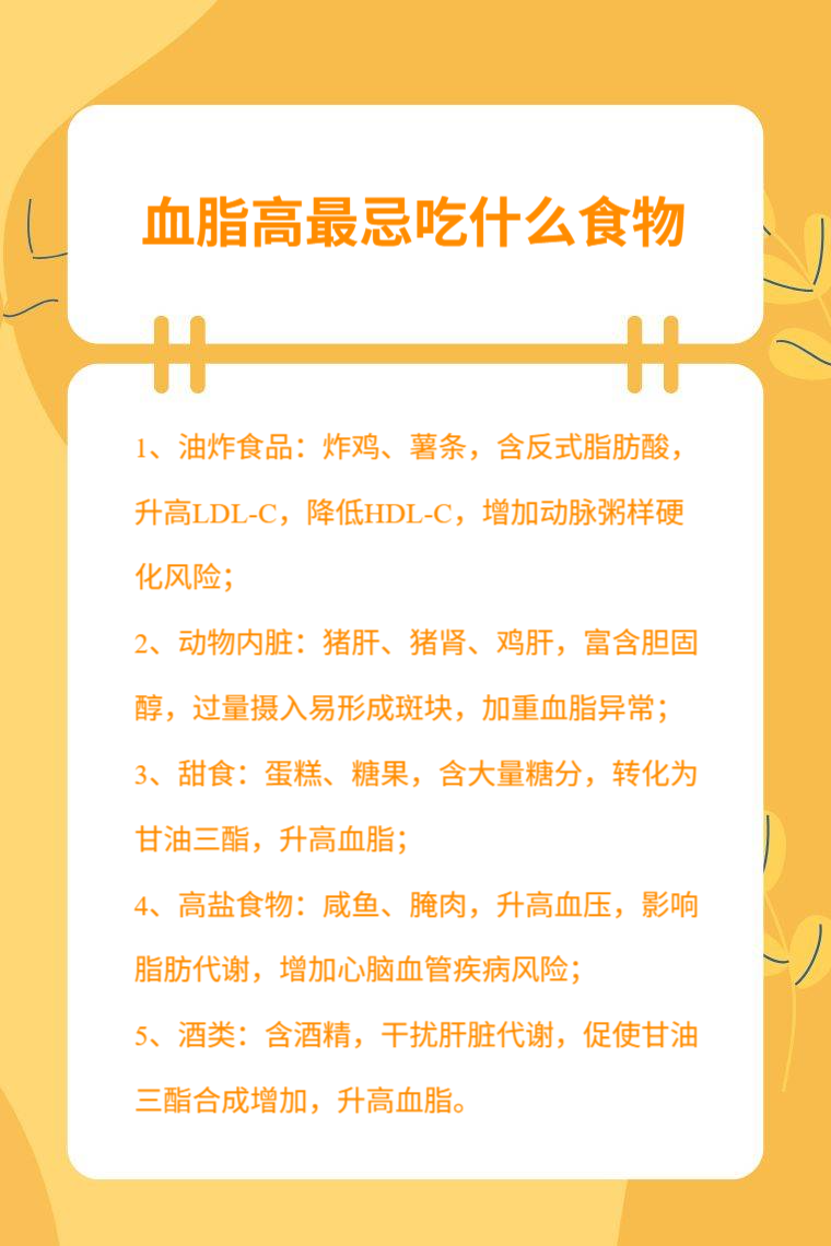 血脂高最忌吃油炸食品、动物内脏、甜食、高盐食物、酒类等。