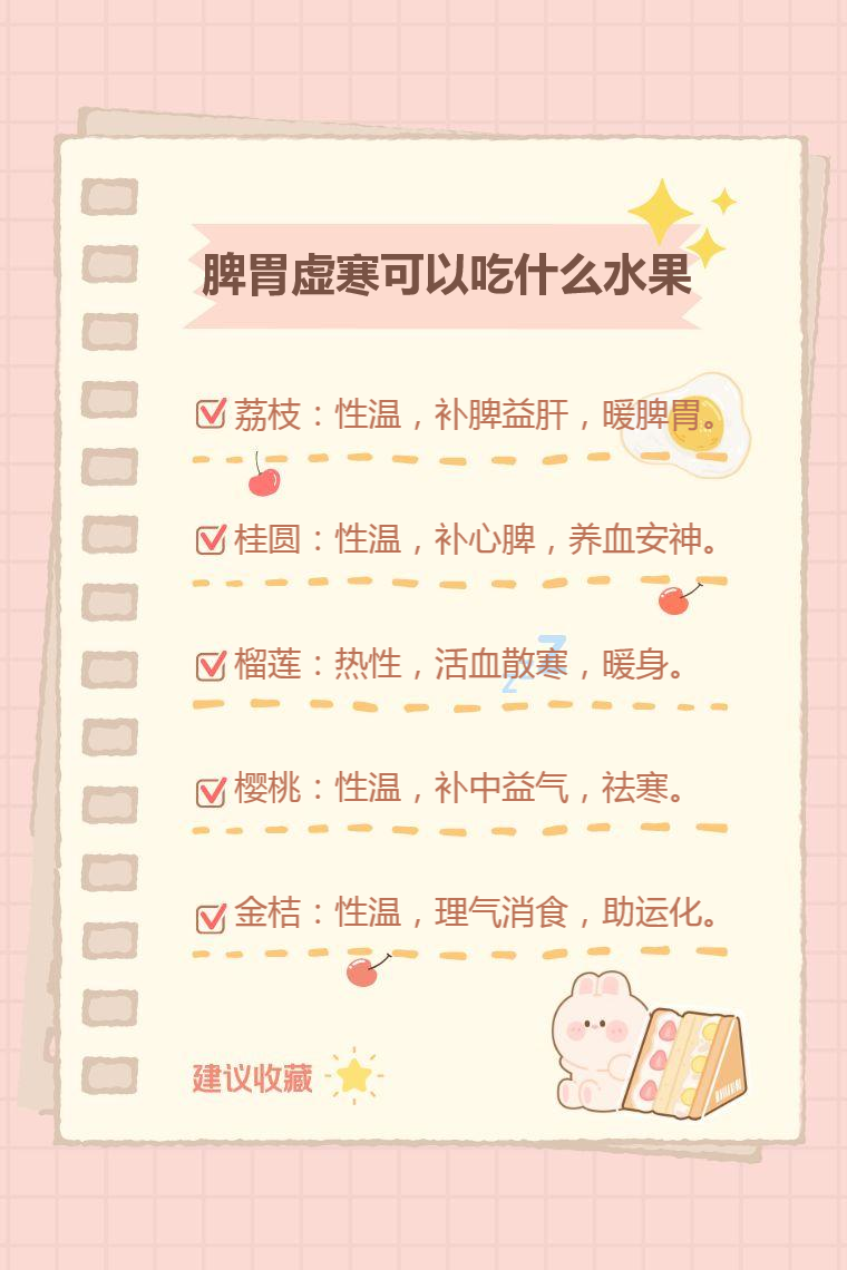 1. 荔枝:性温,味甘、酸,具有补脾益肝、理气补血、温中止痛、补心安神等功效,对于脾胃虚寒人群而言,适量食用荔枝有助于改善脾胃功能,缓解脾胃虚寒带来的不适症状。