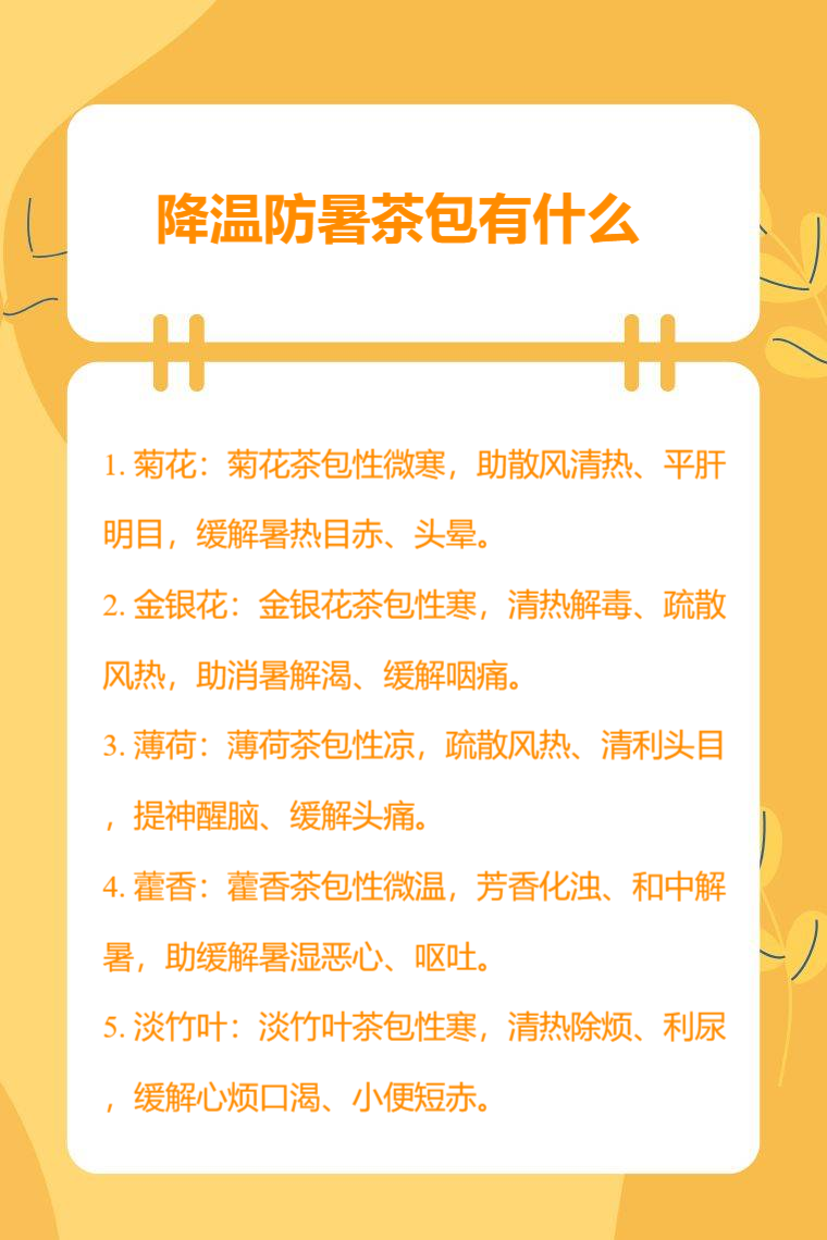菊花、金银花、薄荷、藿香、淡竹叶等都是常见的降温防暑茶包原料。