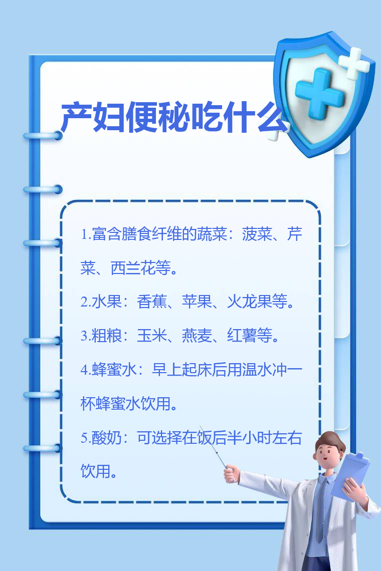 产妇便秘可通过食用富含膳食纤维的蔬菜、水果、粗粮,饮用蜂蜜水、酸奶等进行缓解。