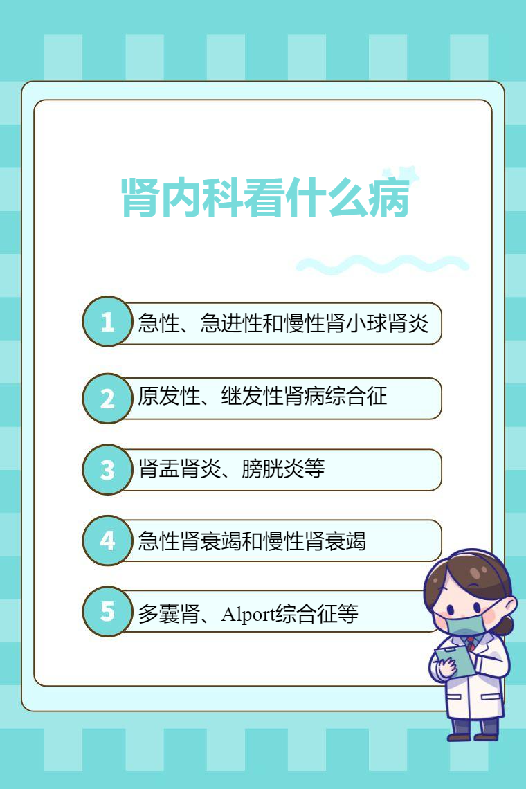 肾内科主要看肾小球肾炎、肾病综合征、尿路感染、肾衰竭、遗传性肾病等。
