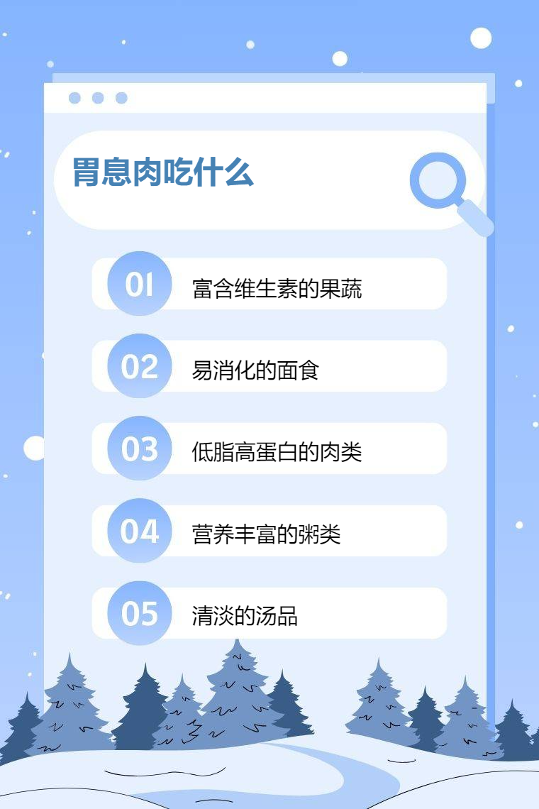 胃息肉患者可选择富含维生素的果蔬、易消化的面食、低脂高蛋白的肉类、营养丰富的粥类、清淡的汤品等。