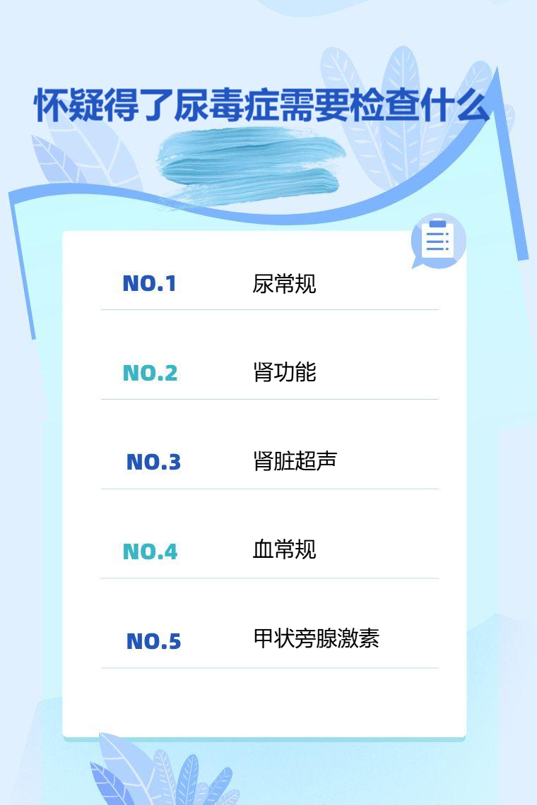 怀疑得了尿毒症需要检查尿常规、肾功能、肾脏超声、血常规、甲状旁腺激素等。