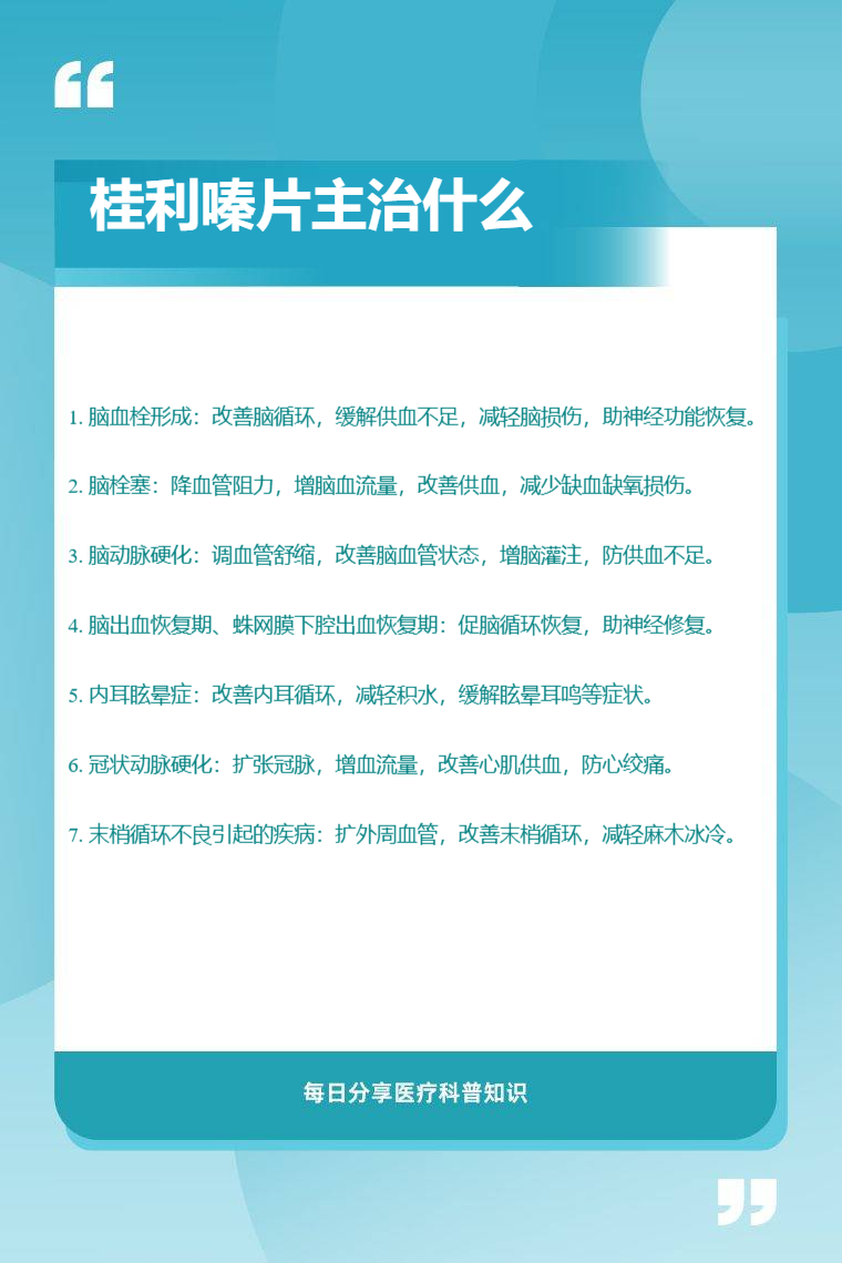 桂利嗪片主治脑血栓形成、脑栓塞、脑动脉硬化、脑出血恢复期、蛛网膜下腔出血恢复期、内耳眩晕症、冠状动脉硬化及由于末梢循环不良引起的疾病等。
