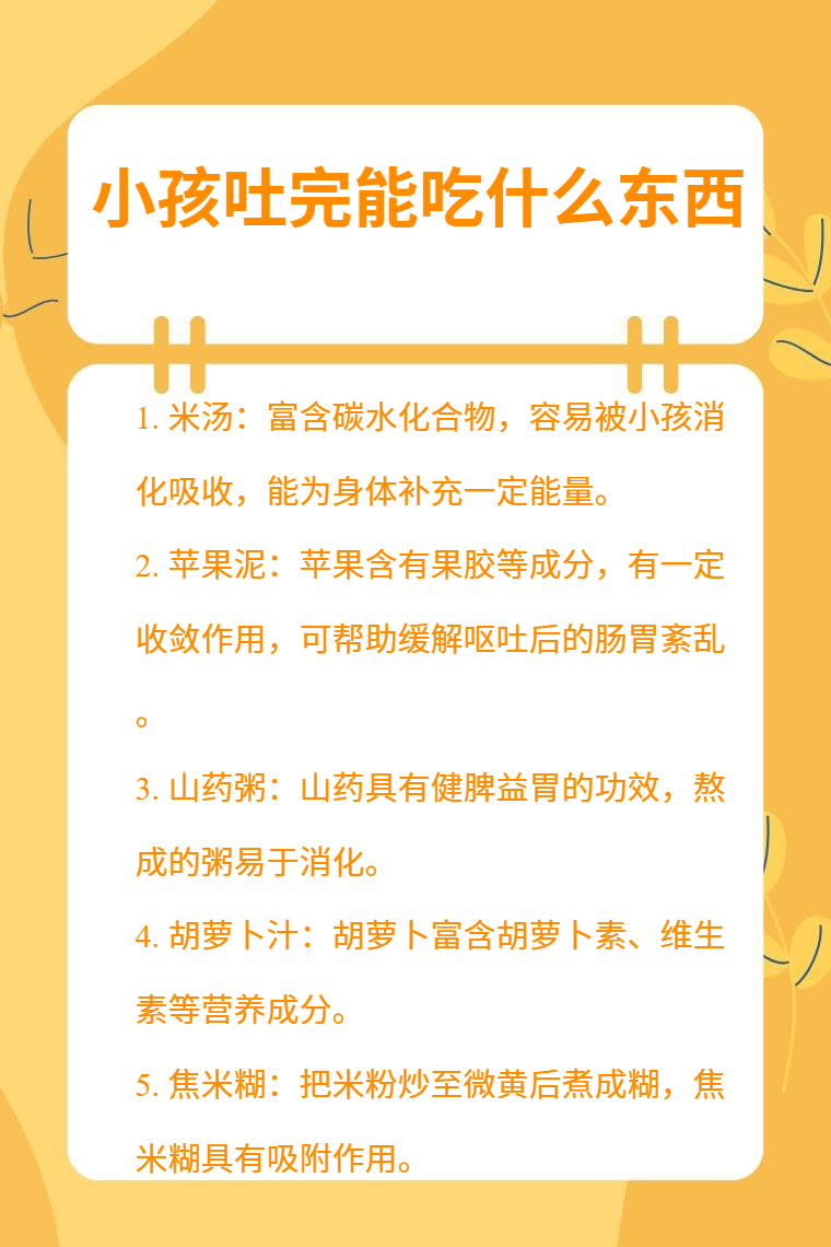 小孩吐完能吃的东西有米汤、苹果泥、山药粥、胡萝卜汁、焦米糊等。
