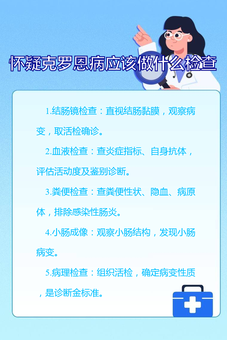 怀疑克罗恩病应该做结肠镜检查、血液检查、粪便检查、小肠成像检查、病理检查等。