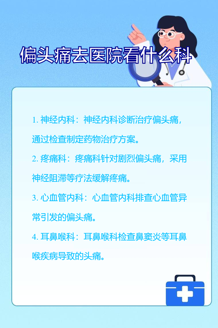 偏头痛去医院可看神经内科、疼痛科、心血管内科、耳鼻喉科等。