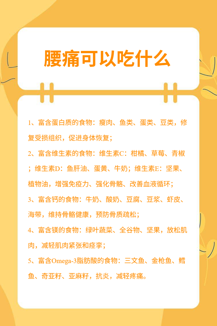 1. 富含蛋白质的食物:蛋白质是身体修复和维持正常生理功能所必需的营养物质,有助于受损组织的修复,对于因腰部肌肉劳损等导致的腰痛有一定帮助。常见的如瘦肉、鱼类、蛋类、豆类及豆制品等,这些食物能为身体提供优质蛋白质,促进身体恢复。