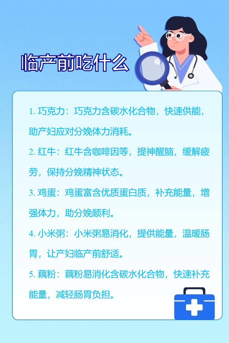 临产前可选择巧克力、红牛、鸡蛋、小米粥、藕粉等。