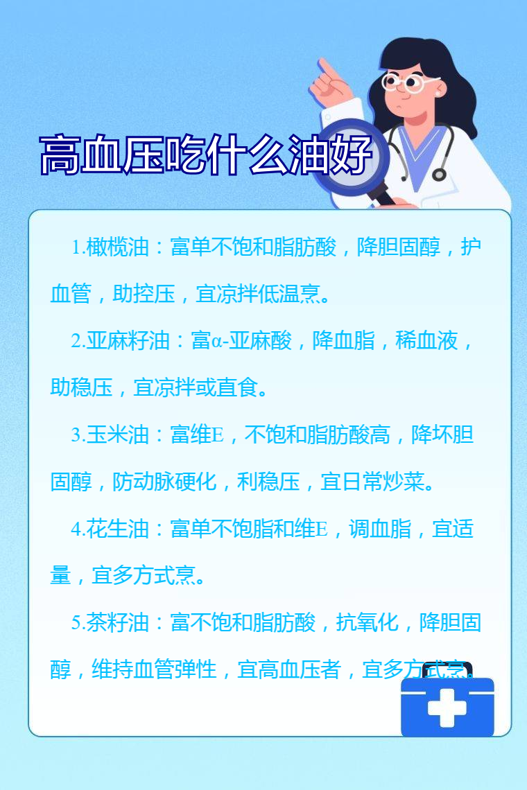 高血压患者可选择的食用油有橄榄油、亚麻籽油、玉米油、花生油、茶籽油等。