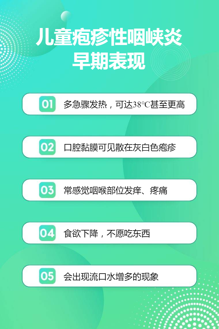 儿童疱疹性咽峡炎的早期表现有发热、口腔疱疹或溃疡、咽喉不适、食欲不振、流口水等。