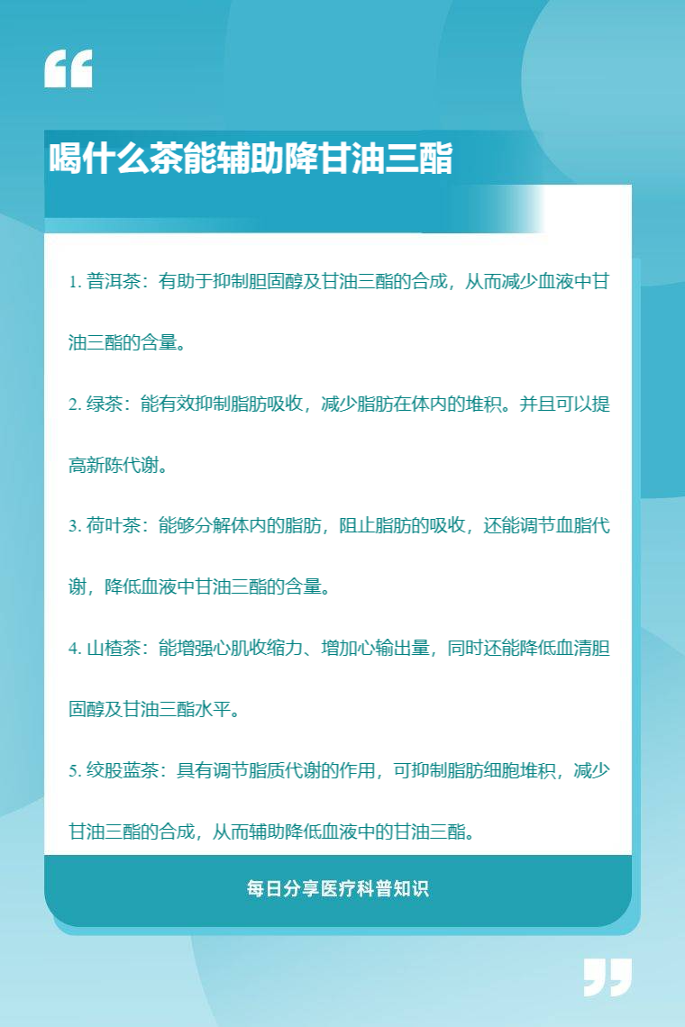 喝普洱茶、绿茶、荷叶茶、山楂茶、绞股蓝茶等能辅助降甘油三酯。