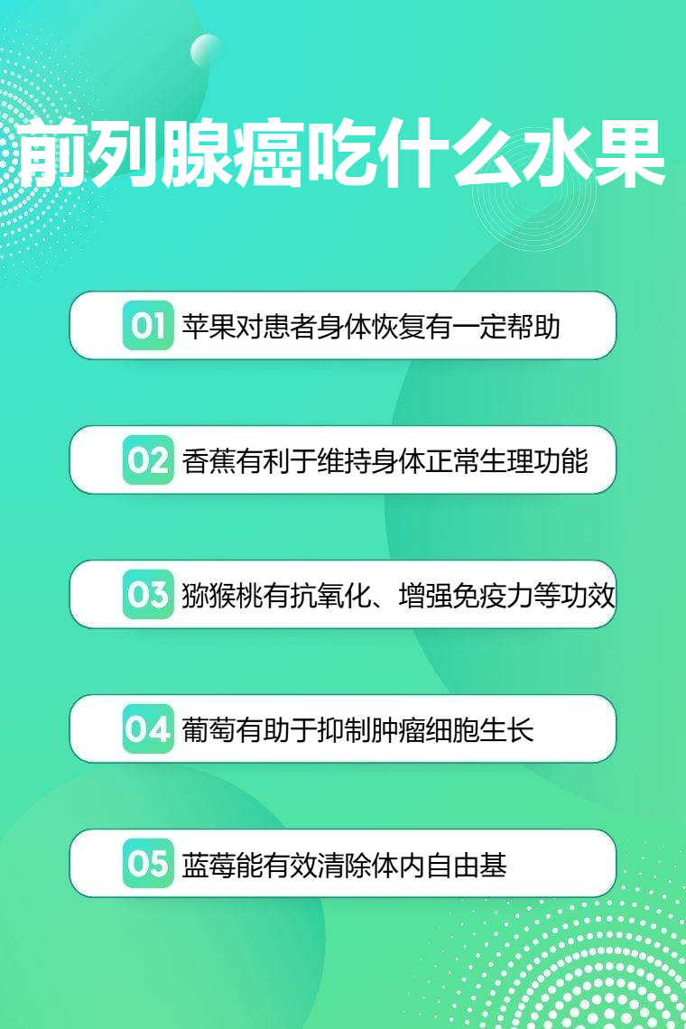 1. 苹果:富含果胶、维生素C等营养成分,果胶有助于促进肠道蠕动,加快体内毒素排出,维生素C具有抗氧化作用,能增强机体免疫力,对于前列腺癌患者身体恢复有一定帮助,可每天食用1 - 2个。