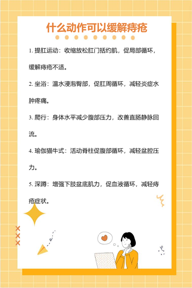 提肛运动、坐浴、爬行、瑜伽猫牛式、深蹲等动作可以缓解痔疮。